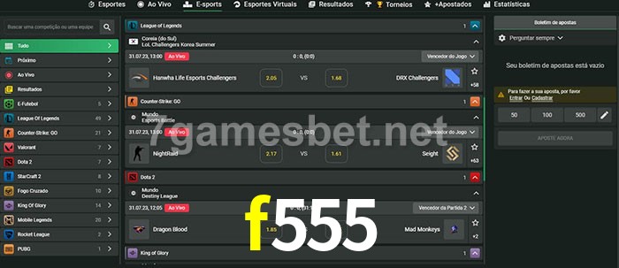 O f555 oferece uma grande seleção de opções de apostas em e-sports com probabilidades competitivas